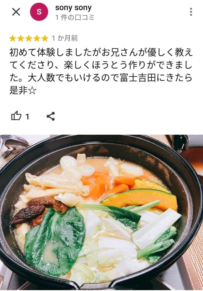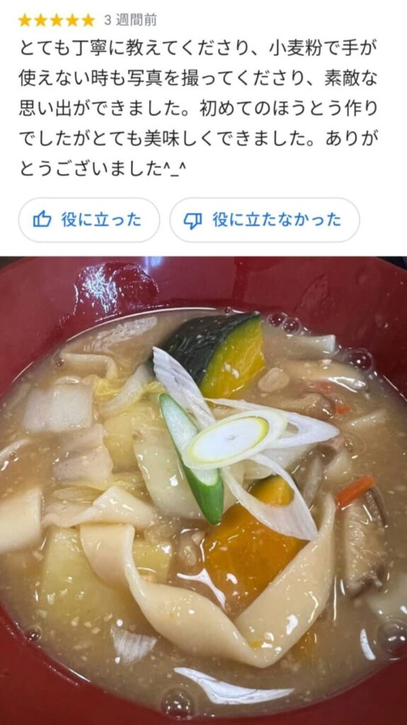 ほうとう作り体験にご参加頂いたお客様からの感想・レビューを一部ですがご紹介致します。