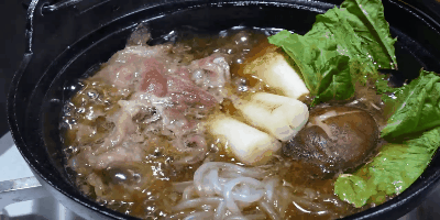 甲州ワインビーフ+季節の野菜+豆腐+しらたき、割り下はワインを隠し味にした甘辛醤油仕立て。